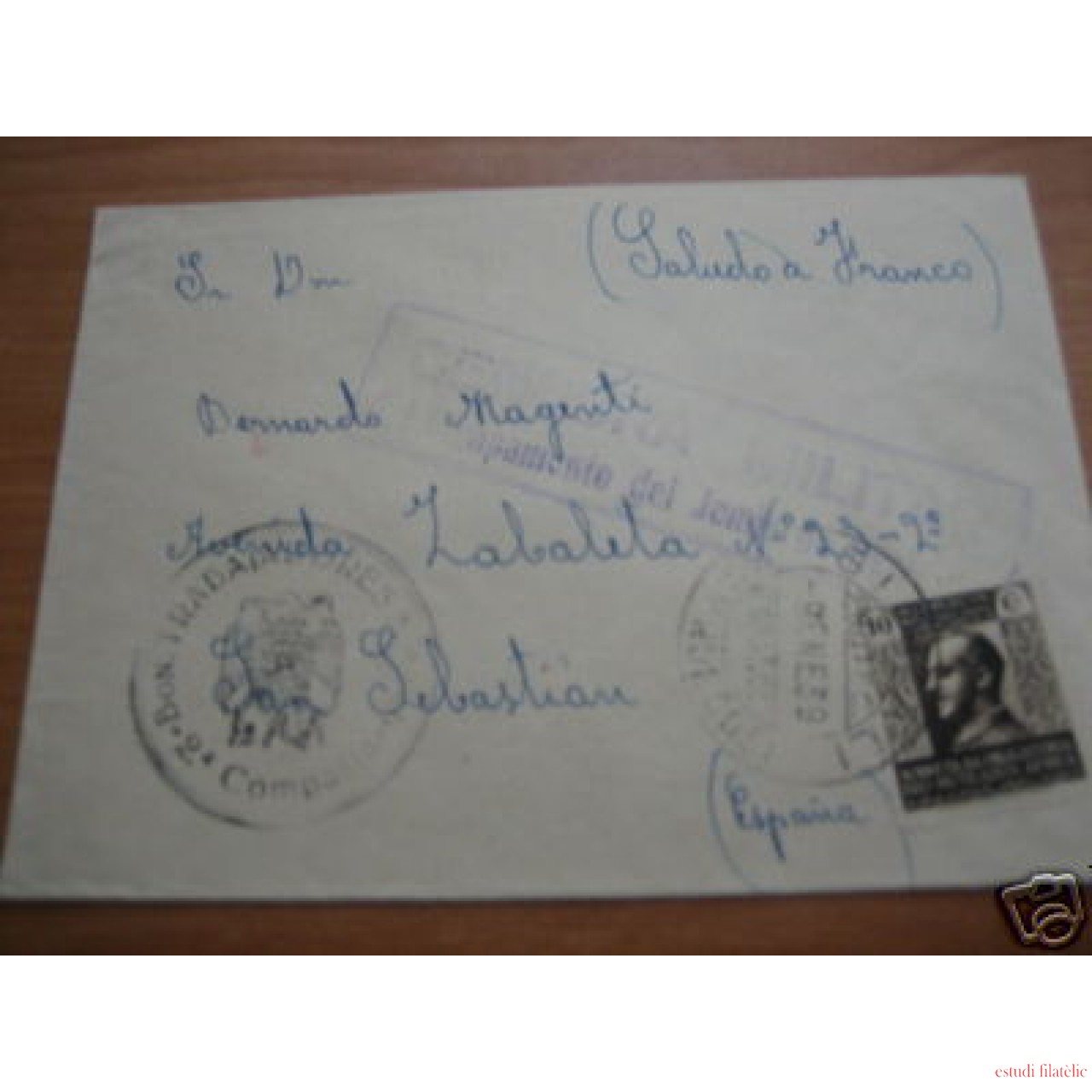 Remitente escrito a mano de la 146 Bon. Trabajadores 2ª Compañía, Campamento del Jesús de Beni Aros, Sector Larache (Marruecos).