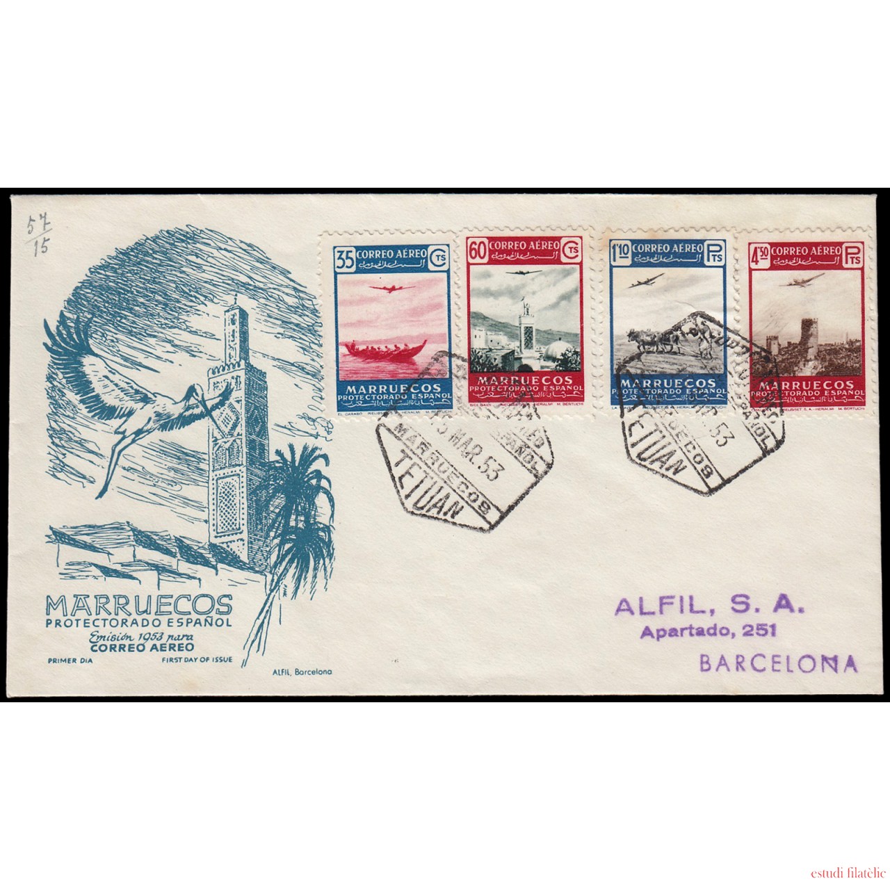 Marruecos Morocco 369/72 1953 Paisajes Avión en vuelo SPD Sobre Primer Día