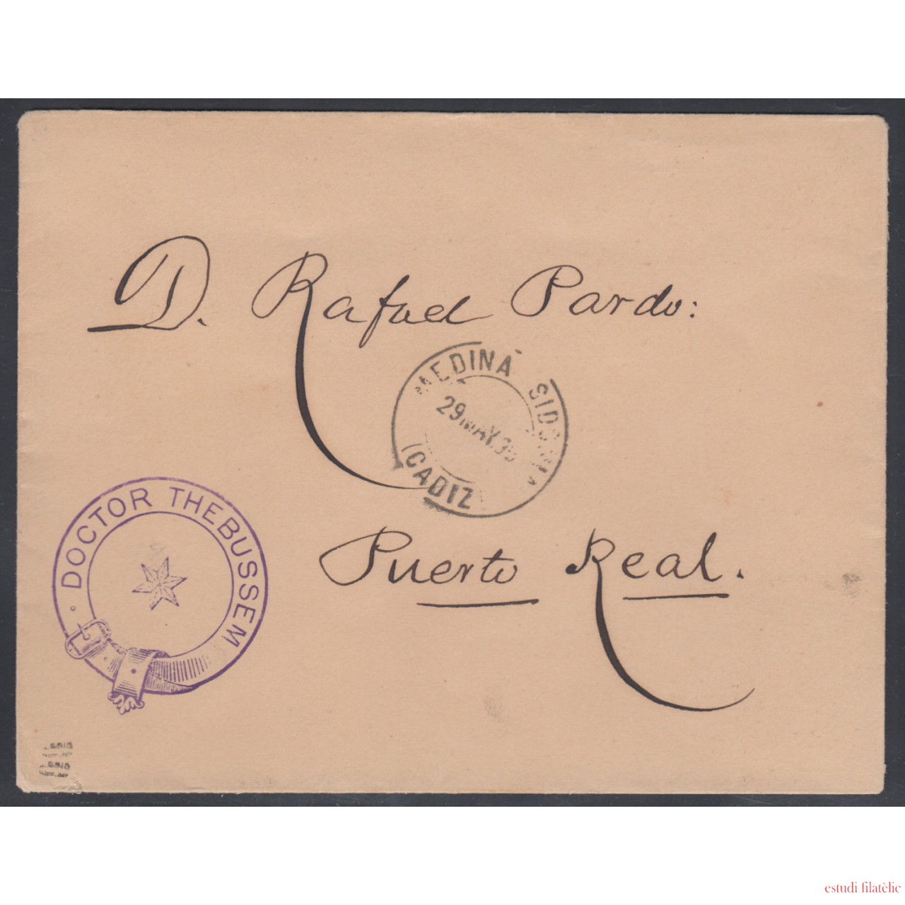 Preciosa carta circulada con franquicia de Dr. Thebussem de Medina de Sidonia a Puerto Real, pieza escasa en carta entera..