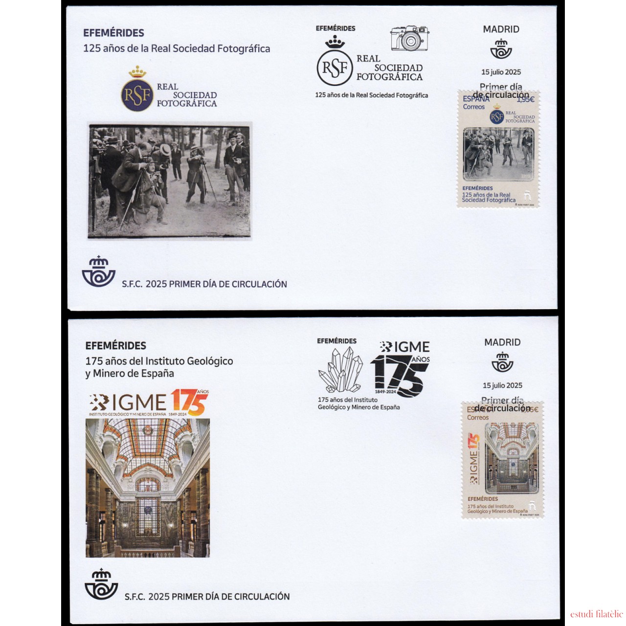 España Spain 5849/50 2025 Efemérides 125 años de la Real Sociedad Fotográfica y 175 años del Instituto Geológico y Minero de España SPD Sobre Primer Día