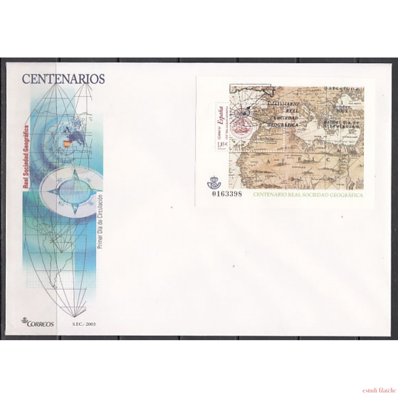 España Spain Nº4021 Año 2003 Centenario de la Real Sociedad Geografica, SPD FDC SOBRE PRIMER DIA,foto estándar