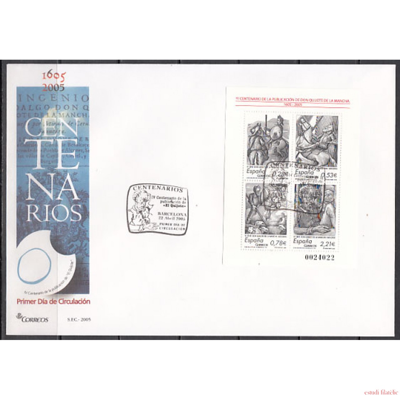 España Spain Nº4161 Año 2005 IV Centenario de la publicación de El Ingenioso Hidalgo Don Quijote de la Mancha SPD FDC SOBRE PRIMER DIA,foto estándar