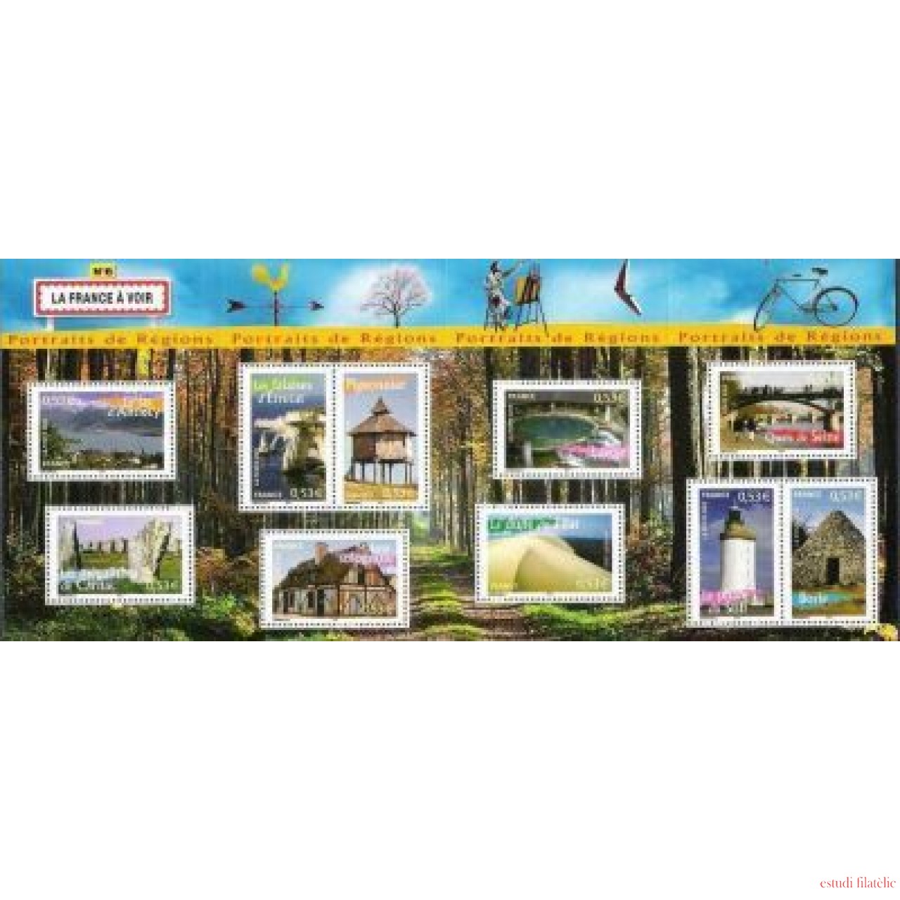France Francia HB 89 2005 Retratos de regiones Edificios, lugares emblemáticos 10 val. nº 3814/23 Ilustración: bosque Lujo