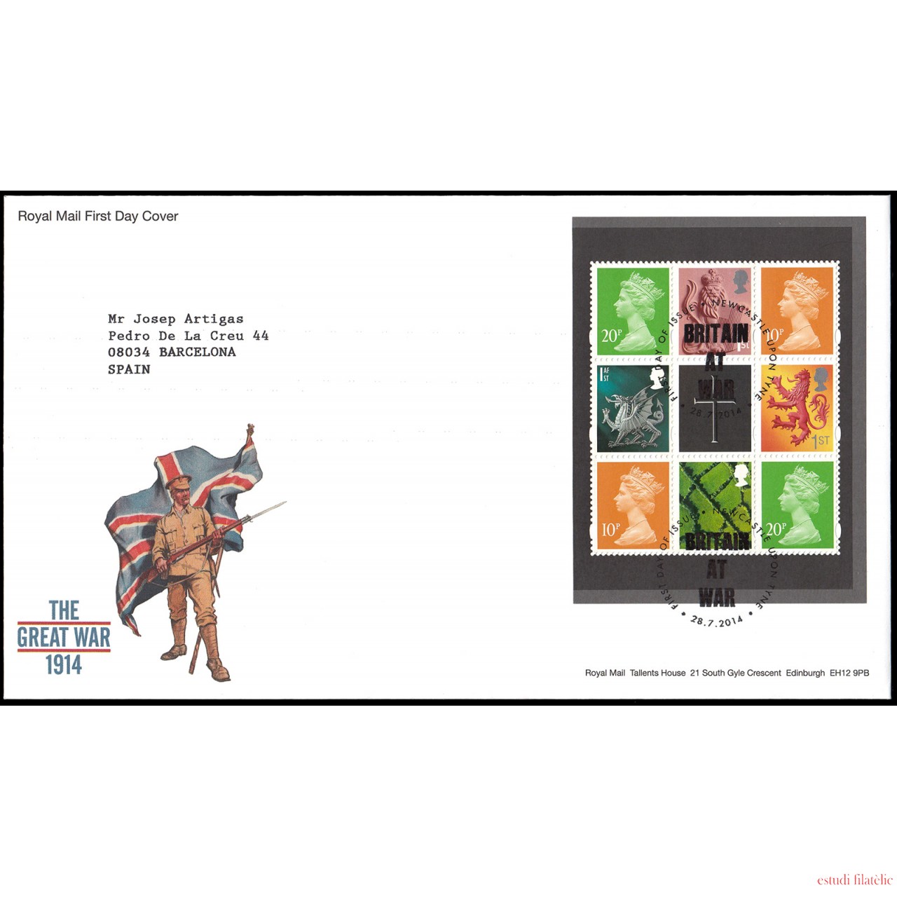 Gran Bretaña C4034a 2014 SPD FDC (4ª hoja) HB de Carné Prestigio Centenario de la primera guerra mundial Newcastle Sobre primer día