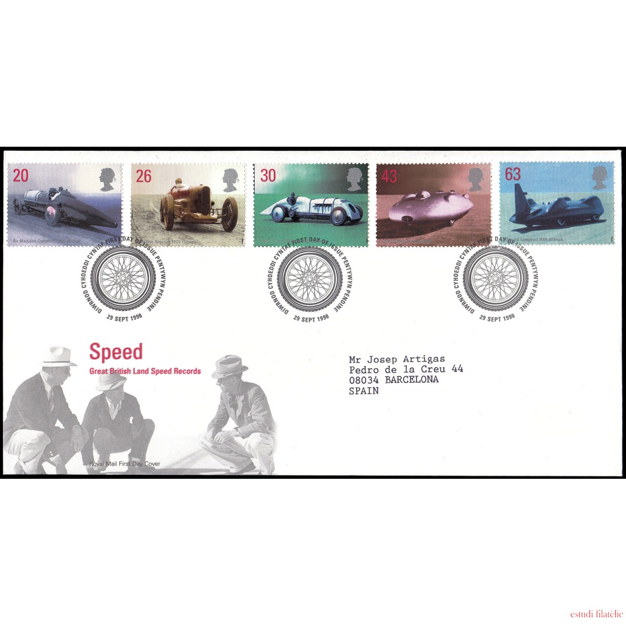 Gran Bretaña 2056/60 1998 SPD FDC Poseedores del récord británico de velocidad en tierra Pentywyn Pendine Sobre primer día