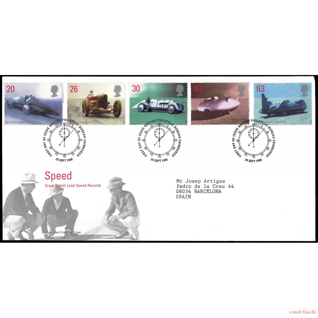 Gran Bretaña 2056/60 1998 SPD FDC Poseedores del récord británico de velocidad en tierra Philatelic Bureau Sobre primer día