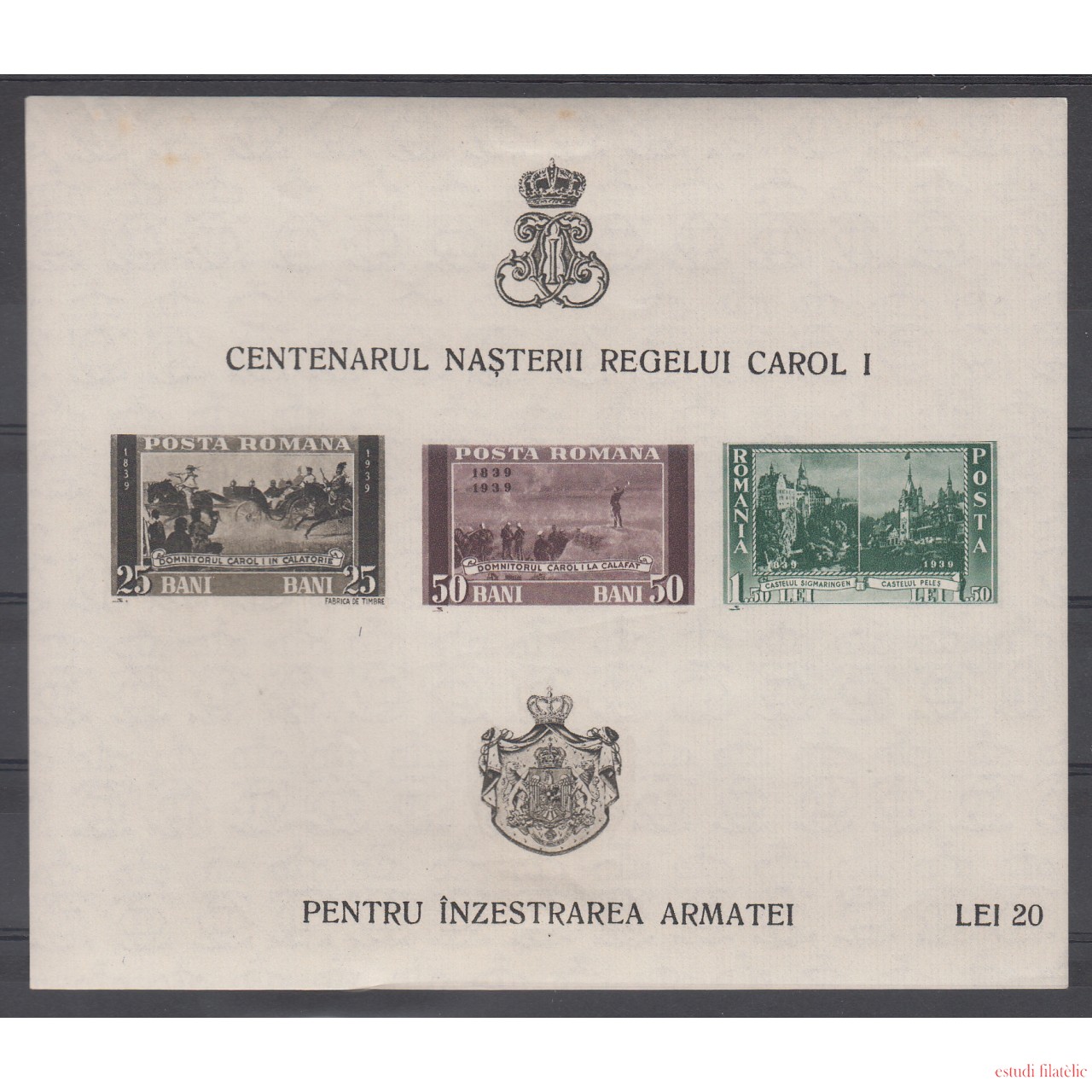 Rumanía - 3 S/D 1939 - 40 Centenario Carlos I Hojita nueva sin fijasellos MNH Sombras