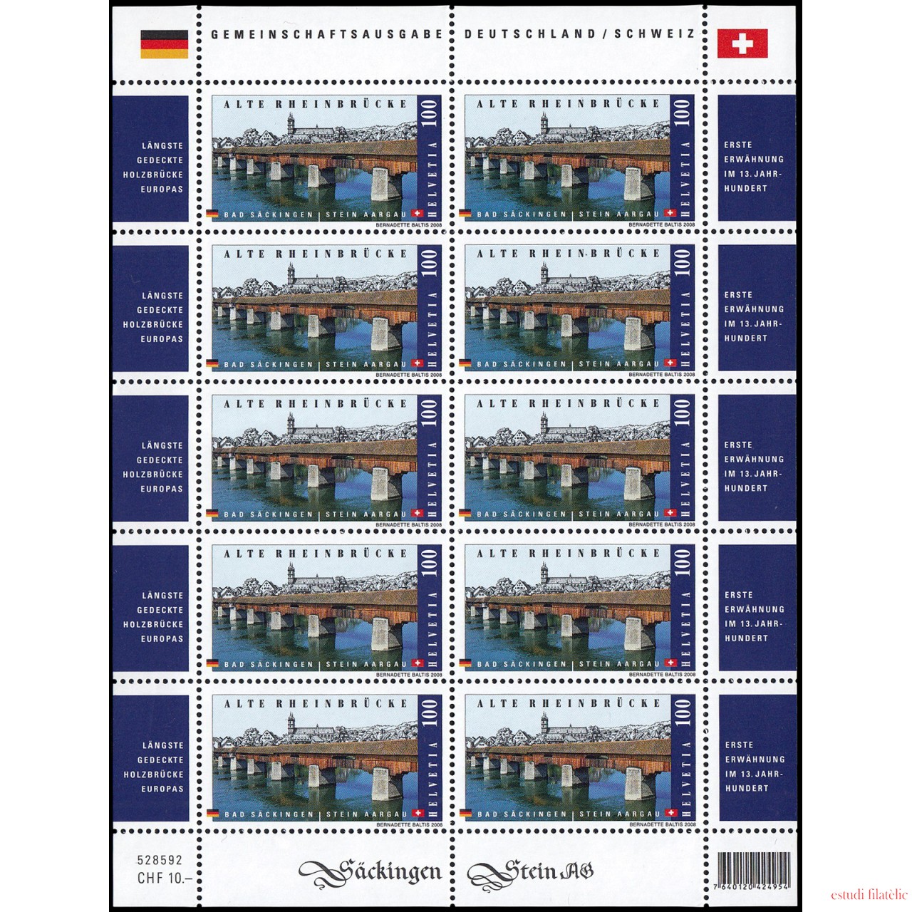 Suiza Switzerland 1994 2008 Antiguo puente de Bad Sackingen sobre el Rhin, Alemania y Suiza minihojita MNH