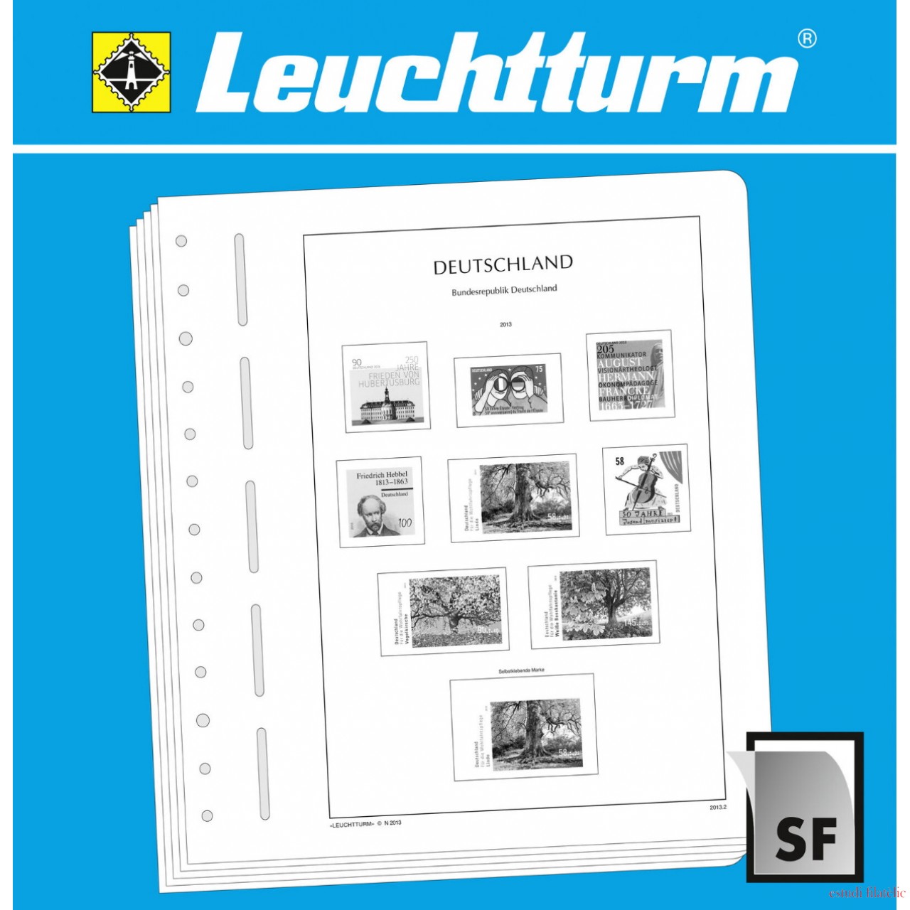 Los álbumes preimpresos LEUCHTTURM (formato 270 x 297 mm, perforación de 13 agujeros) están impresos en cartón de madera sin ácidos (170 g/m2), resistente al envejecimiento y con impresión offset en blanco y negro que reproduce fielmente los detalles. De esta forma, usted puede encontrar rápidamente los sellos que todavía le faltan. Sobre la impresión de los sellos y con el mismo tamaño, están pegados filoestuches-SF fabricados en poliestirol transparente, antireflectante y sin plastificantes. Estos filoestuches sujetan los sellos, a la vez que ofrecen una máxima protección contra el polvo y la humedad.