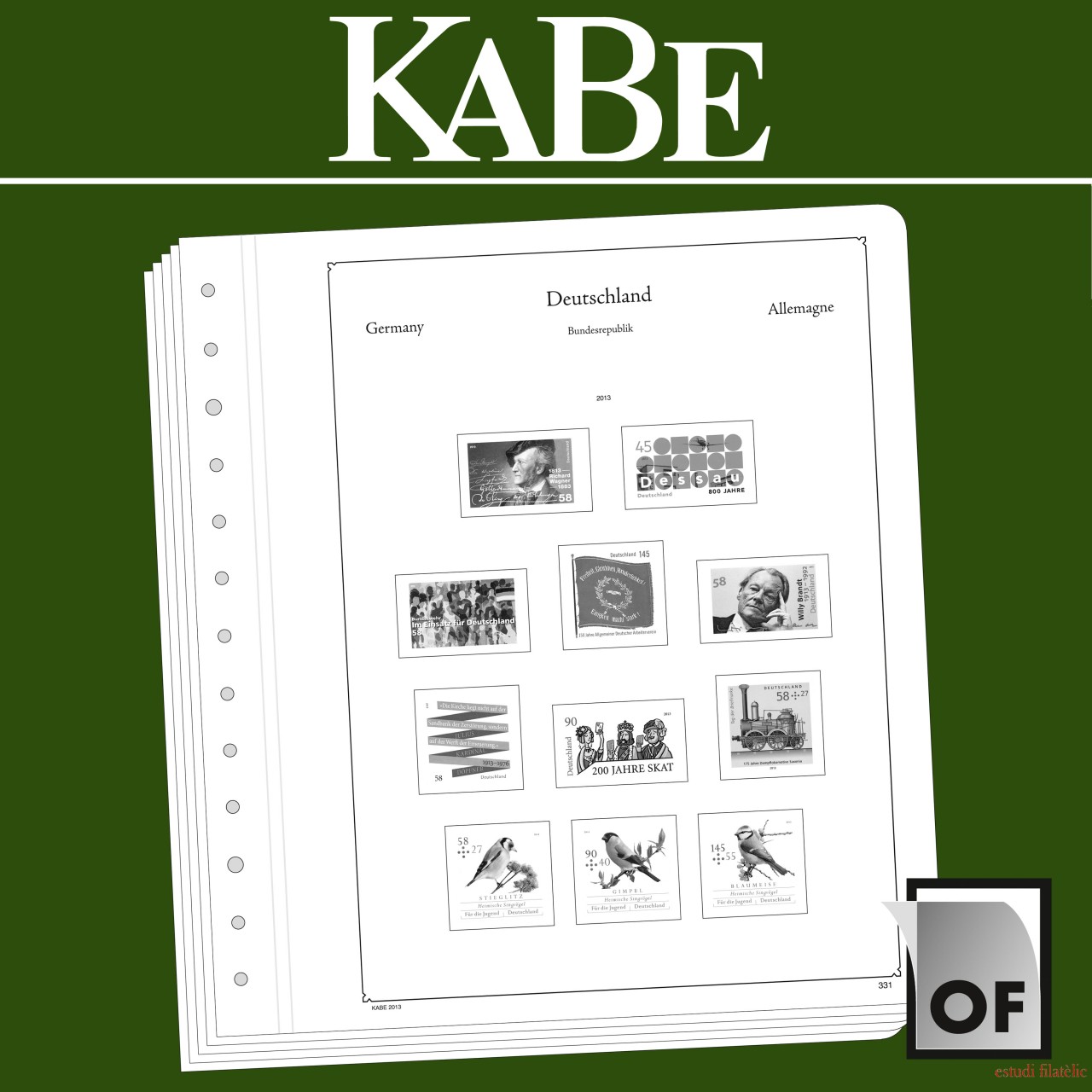 Los álbumes preimpresos KABE (formato 275 x 310 mm) están impresos en cartón de madera sin ácidos (175 g/m2), resistente al envejecimiento y con impresión offset en blanco y negro que reproduce fielmente los detalles. De esta forma, usted puede encontrar rápidamente los sellos que todavía le faltan. Sobre la impresión de los sellos y con el mismo tamaño, están pegados filoestuches-SF fabricados en poliestirol transparente, antireflectante y sin plastificantes. Estos filoestuches sujetan los sellos, a la vez que ofrecen una máxima protección contra el polvo y la humedad. La articulación doble de lino facilita la apertura de las hojas y ayuda para su mejor conservación.