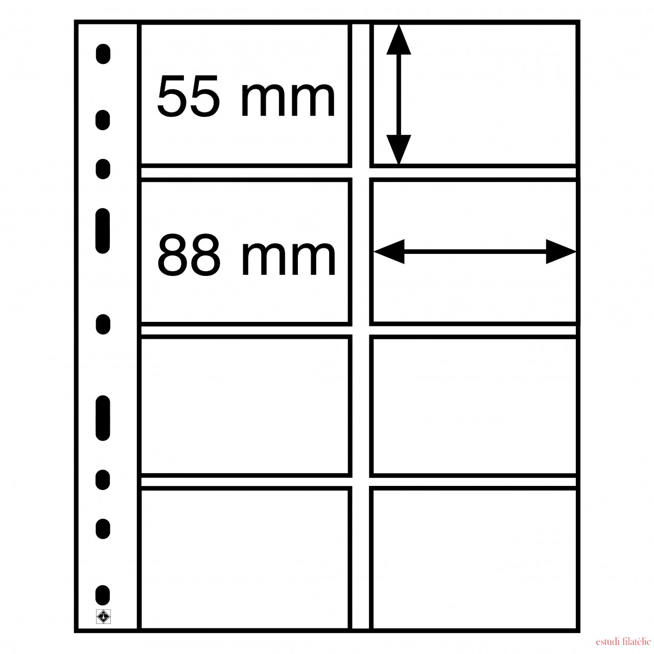 Hojas de plástcio OPTIMA en formato 202 x 252 mm, 4 divisiones para tarjetas telefónicas para formatos hasta 88 x 55 mm. Transparente.