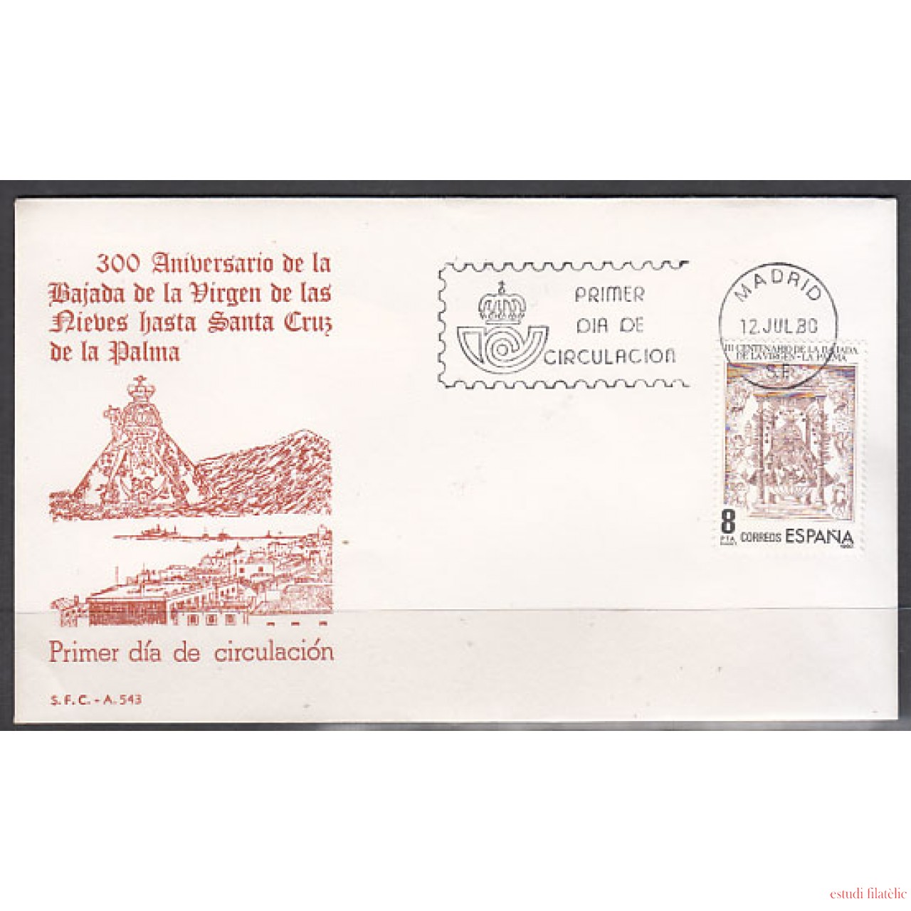 España Spain Nº2577 Año 1980 CCC Aniversario de la Fundación de la bajada de Nuestra Señora de las Nieves desde su Santuario a Santa Cruz de la Palma,SPD FDC SOBRE PRIMER DIA, foto estándar