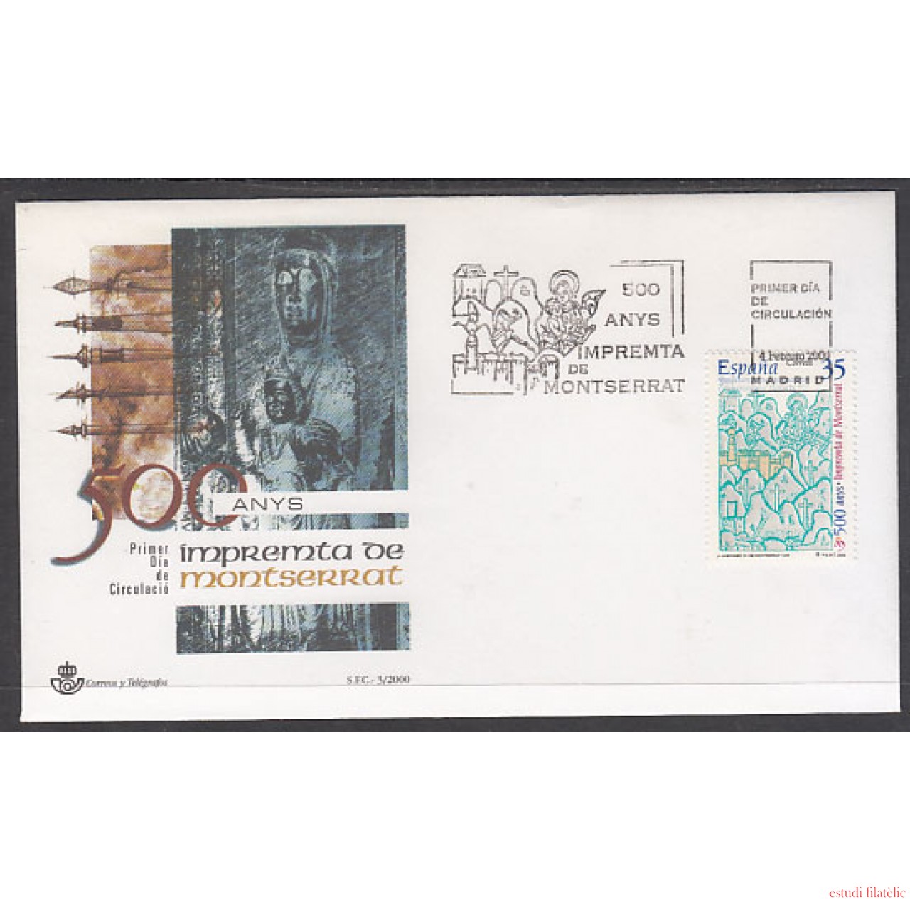 España Spain Nº3696 Año 2000 D Años de la imprenta de Montserrat ,SPD FDC SOBRE PRIMER DIA,foto estándar