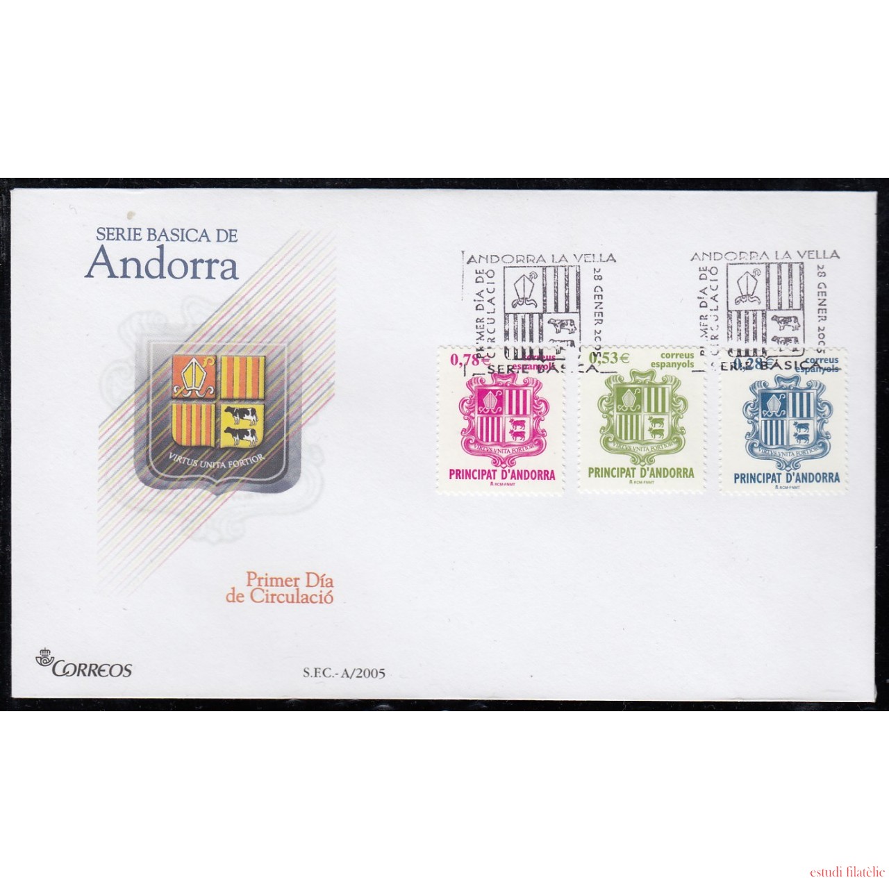 Andorra Española 324/26 2005 Principado de Andorra, escudos SPD Sobre Primer día